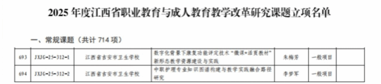 近日,江西省教育厅公布2025年度职业教育与成人教育教学改革研究项目立项名单,我校获2项申报指标且全部成功获批,申报成功率100%,充分彰显了学校以教改课题为抓手、深化职业教育内涵建设的扎实成效。