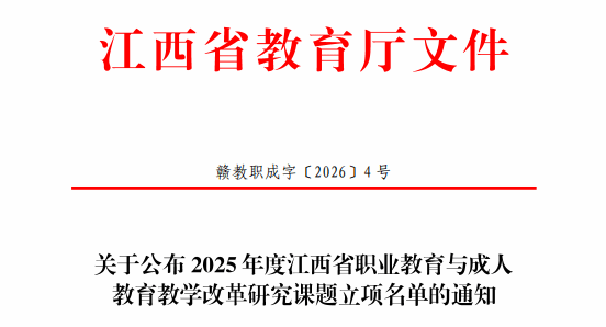 近日,江西省教育厅公布2025年度职业教育与成人教育教学改革研究项目立项名单,我校获2项申报指标且全部成功获批,申报成功率100%,充分彰显了学校以教改课题为抓手、深化职业教育内涵建设的扎实成效。