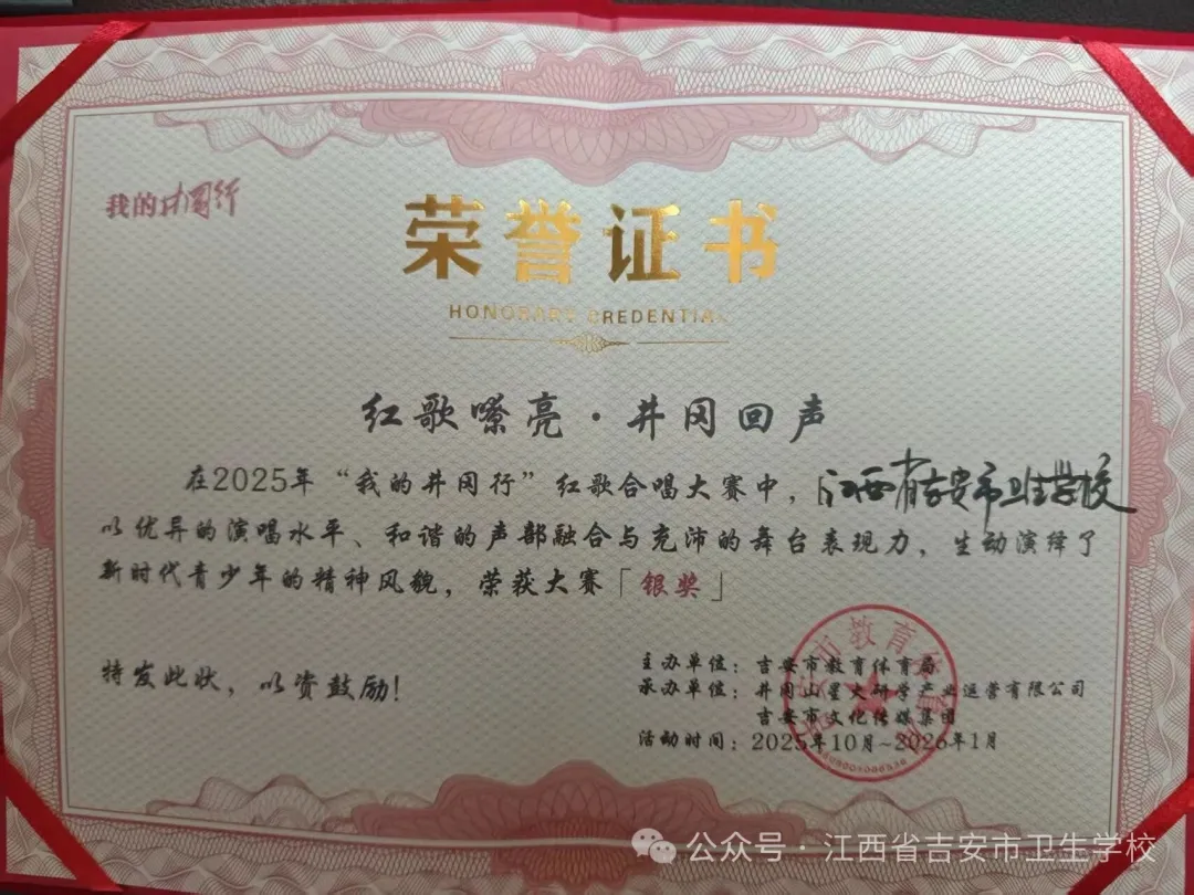 我校合唱团凭借扎实的演唱功底、和谐的声部融合与饱满的精神面貌,在众多参赛队伍中脱颖而出。舞台上,同学们身着盛装,以一首《如愿》深情演绎,用嘹亮的歌声传递对革命先辈的敬意,展现了新时代卫校学子的家国情怀与青春风采。从排练到登台,指导老师与全体队员凝心聚力、反复打磨,最终收获了大赛银奖!