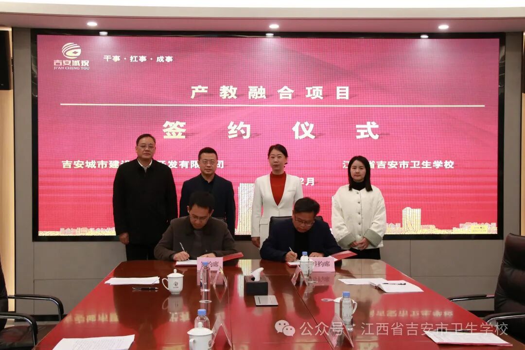 2025年12月24日,吉安卫校与吉安市城市建设投资开发有限公司(以下简称市城投公司)在高铁新区总部经济大楼举行产教融合项目签约仪式。吉安卫校党委书记曾晋娟,市城投公司党委副书记、总经理周春根等领导出席并见证签约。