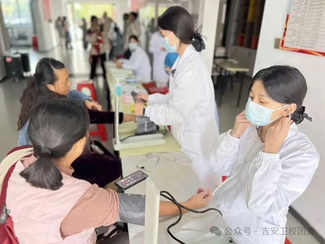 活动现场,吉安卫校红医先锋班志愿者们为社区老人免费提供测量血压、健康咨询等服务,并对患有高血压等老年人群进行了针对性专业指导。