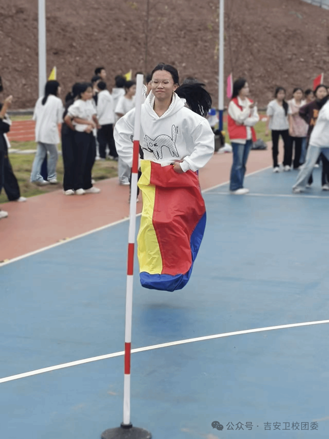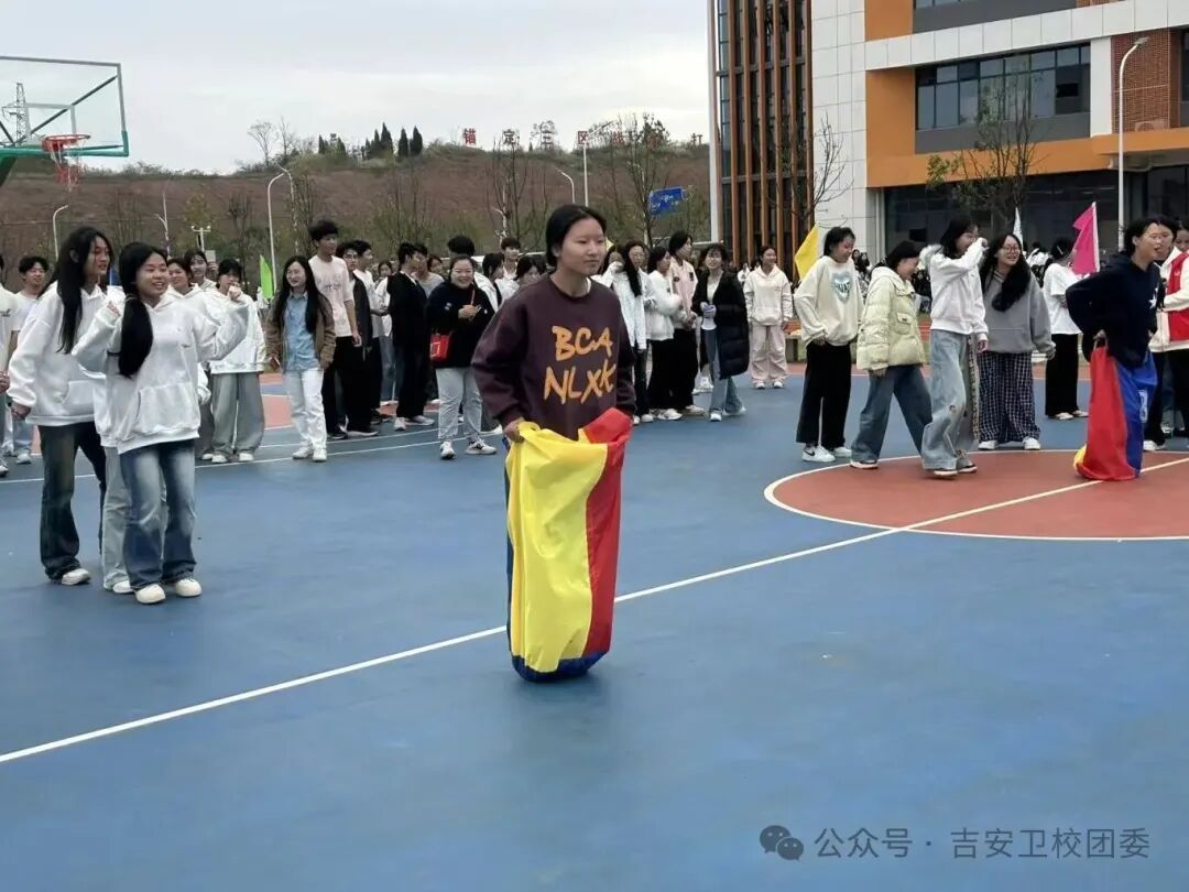 袋鼠跳赛场,活力四射!选手们如同灵动的小袋鼠,轻快地跃动在赛道上。每一次起跳,都是对自我的挑战;每一次落地,都是坚定的信念。尽管双腿被布袋束缚,却阻挡不了你们前进的脚步。用跳跃诠释速度,用坚持书写荣耀。加油!运动健儿们!胜利就在前方!