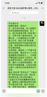 3月24日,通过在班级群内发布电子节水倡议书,并宣传节约用水的做法。希望更多的同学养成良好的用水习惯,提高节水意识,争做节约用水的模范。