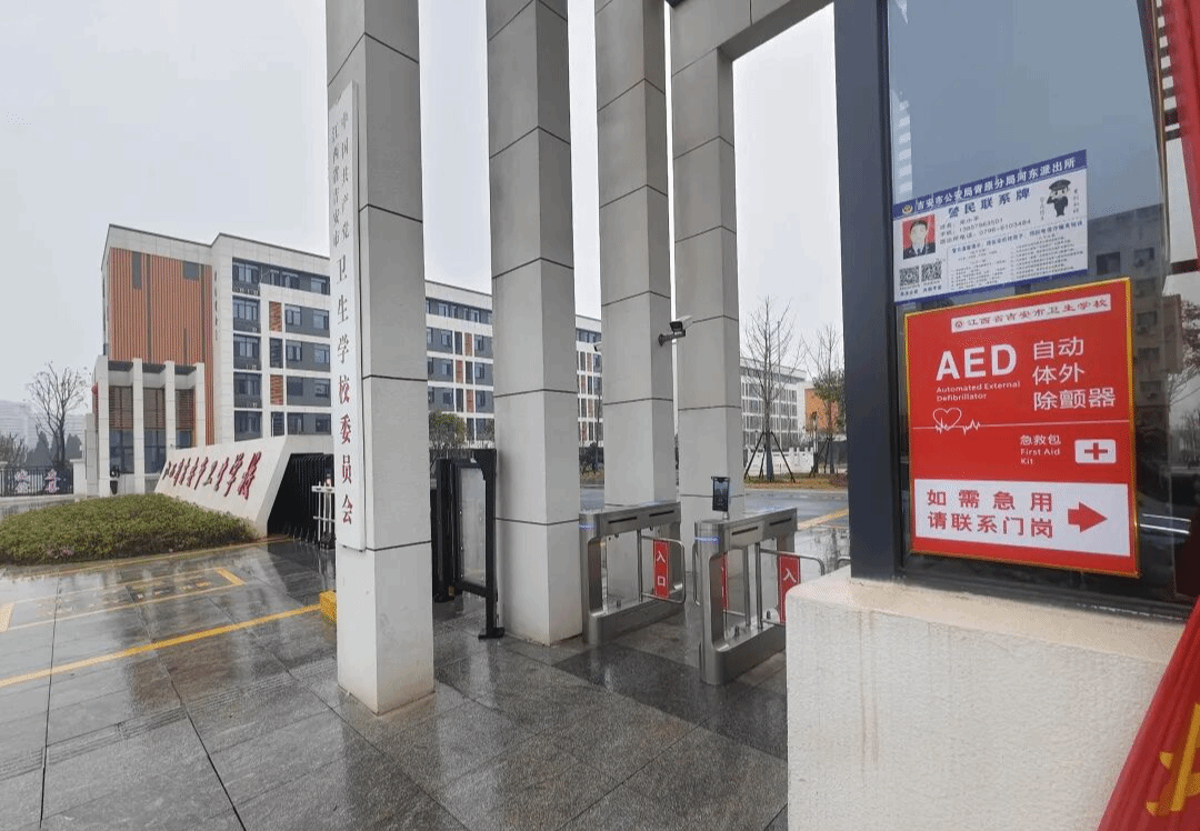 01. 科学选址:将AED安装在链接学生活动场所与教学场所的关键区域、人员密集处,张贴明显标识,方便紧急取用;