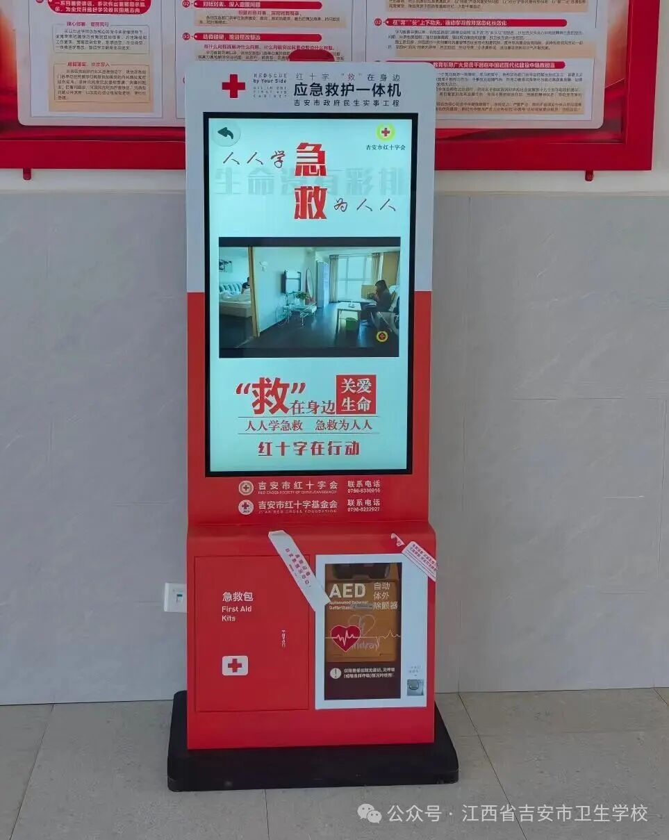生命至上,“救”在身边!近日,吉安市红十字会向我校投放一台应急救护一体机,包含AED(自动体外除颤仪)急救设备,为全校师生及周边群众筑牢“黄金4分钟”应急防线。在此,我校全体师生向红十字会致以最诚挚的感谢!