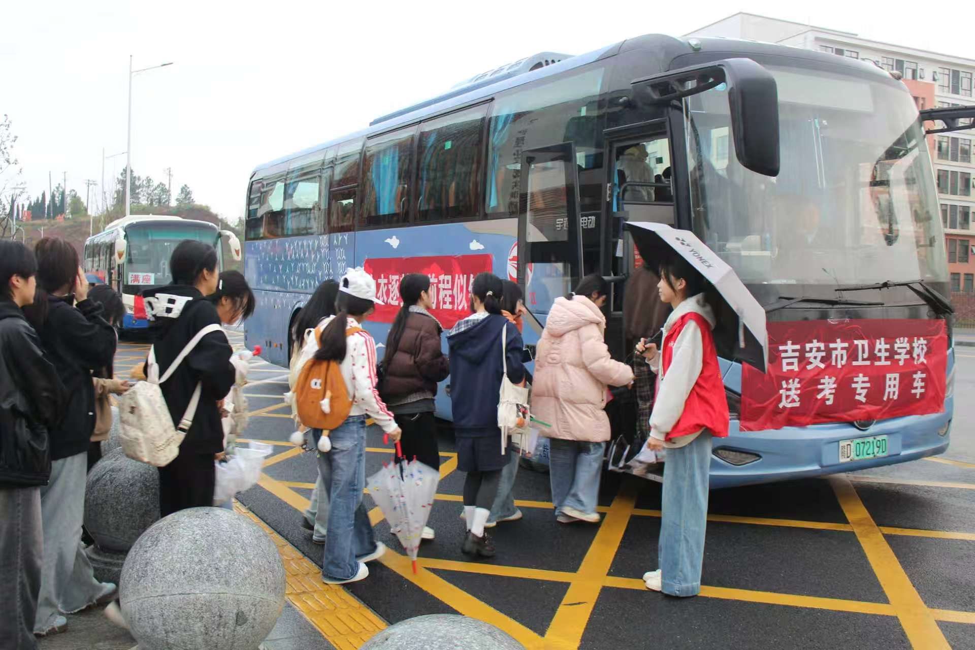 为保障考试顺利,学校统一安排专属送考车辆,从校园到考点全程护送,避开雨天拥堵与路途奔波,让学子们轻装上阵、安心应考。清晨,送考车队整齐列队,满载希望与祝福准时出发,成为雨中一道有序而温暖的风景。